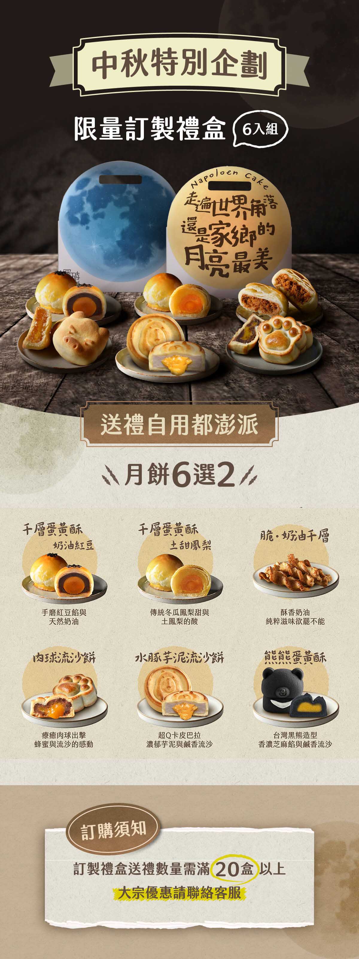千層蛋黃酥、流沙餅和肉鬆餅,六款糕點任選二款,共六入!數量只要到達20盒以上,就可以客制一款專屬的中秋禮盒。加入購物車、結帳並留下聯絡資訊,我們將主動與您聯絡訂制細節。